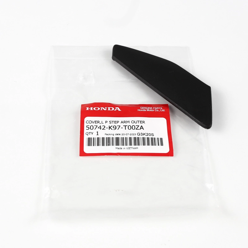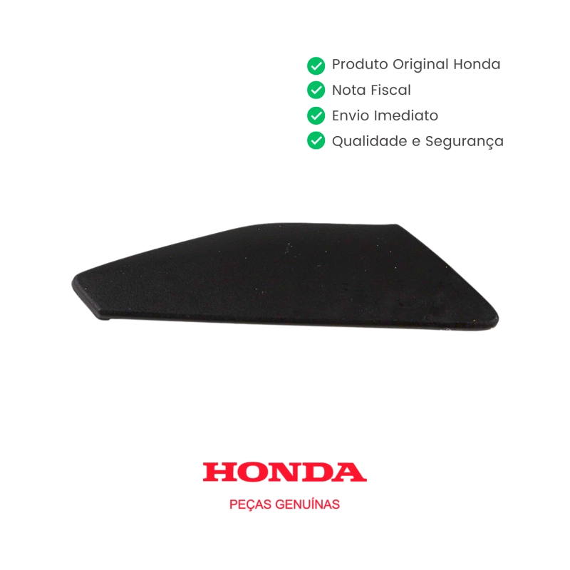 O acabamento do pedal de apoio traseiro lado esquerdo original Honda tem a função de proteger e dar acabamento ao conjunto da pedaleira do passageiro, contribuindo para a estética, segurança e durabilidade do componente. Produzido conforme o padrão original de fábrica, garante encaixe perfeito, excelente resistência e preservação do visual original da motocicleta, sem necessidade de adaptações.