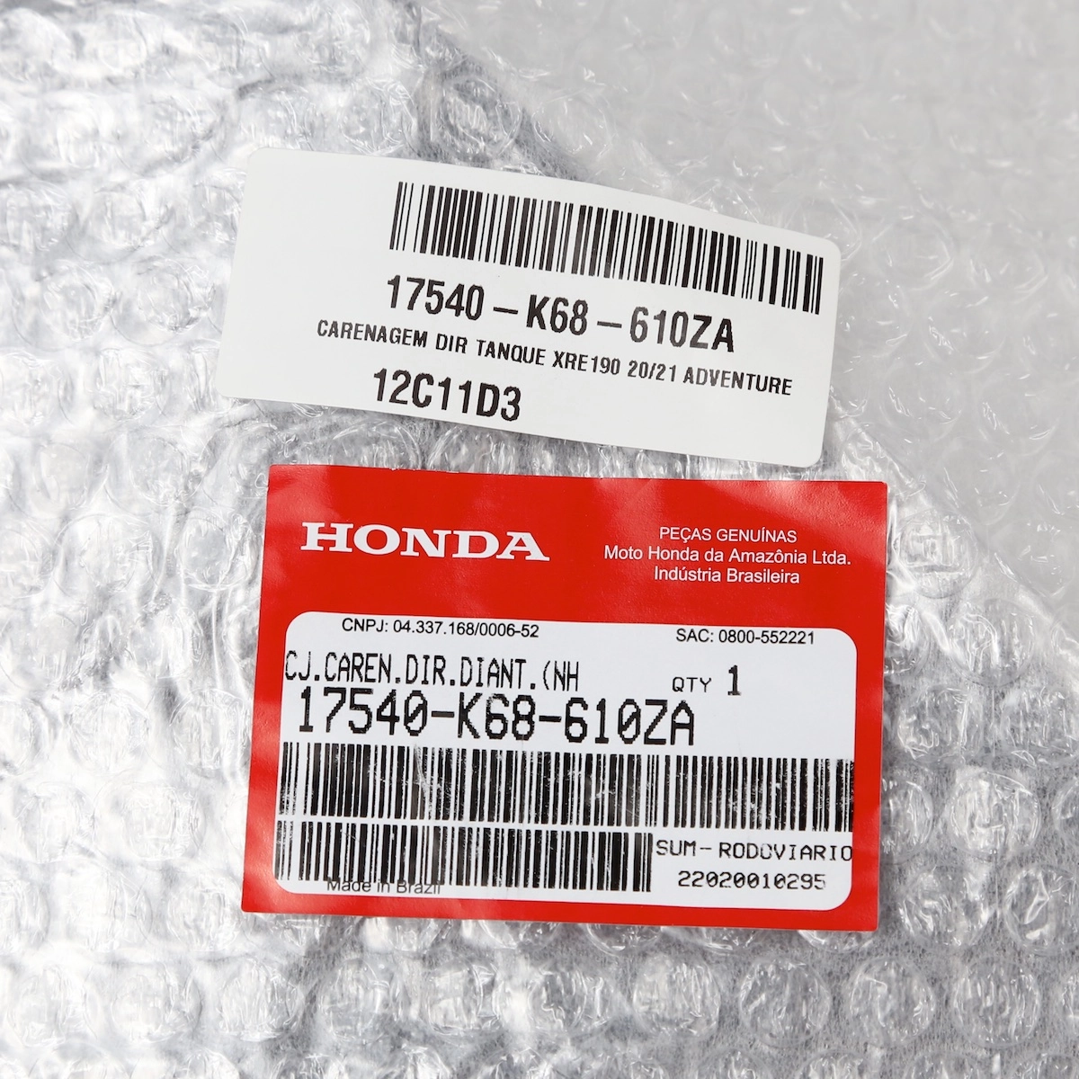 A carenagem direita do tanque original Honda tem a função de proteger o tanque de combustível e compor o acabamento lateral da motocicleta, mantendo o design e a aerodinâmica conforme o padrão de fábrica. Fabricada com material de alta resistência, oferece encaixe perfeito, excelente durabilidade e acabamento original, sem necessidade de adaptações.