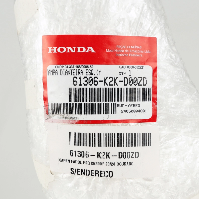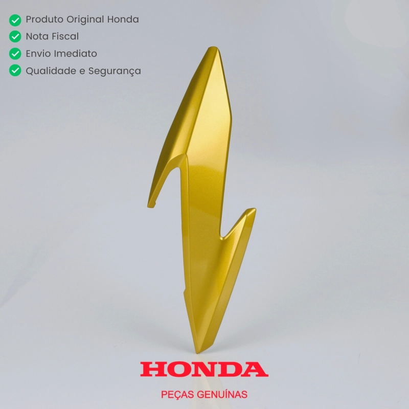 Peça genuína Honda utilizada no acabamento lateral do conjunto do farol da CB 300F. Possui pintura original Dourado Trophy Metálico, garantindo encaixe perfeito, alinhamento correto e acabamento fiel ao padrão de fábrica, preservando a estética e a funcionalidade da motocicleta.