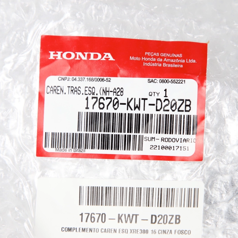 O complemento de carenagem esquerda original Honda tem a função de realizar o acabamento e a proteção do conjunto lateral da motocicleta, auxiliando na fixação e no alinhamento das carenagens. Produzido conforme o padrão original de fábrica, garante encaixe perfeito, resistência e acabamento adequado, sem necessidade de adaptações.