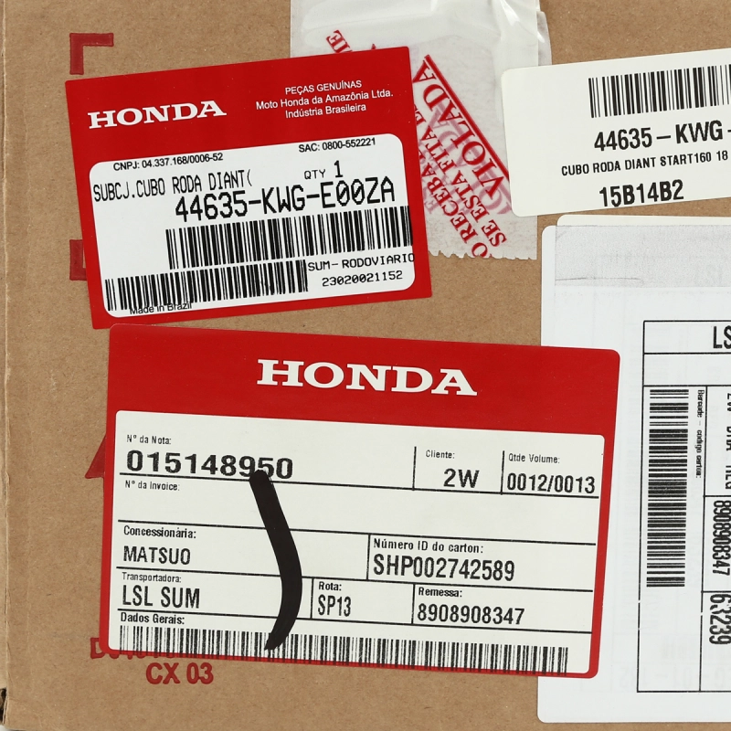 O cubo da roda dianteira original Honda é responsável por alojar os rolamentos e permitir a rotação suave da roda, garantindo alinhamento, estabilidade e segurança durante a pilotagem.