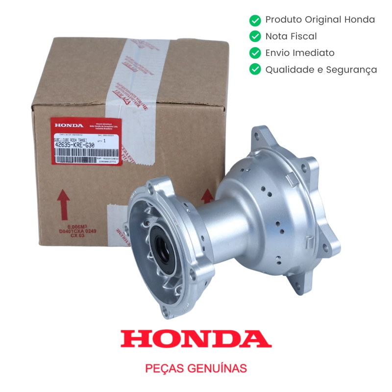 O cubo de roda traseira original Honda para freio a disco foi desenvolvido para garantir o correto funcionamento do conjunto da roda, proporcionando alinhamento preciso, segurança e durabilidade ao sistema de frenagem e transmissão.