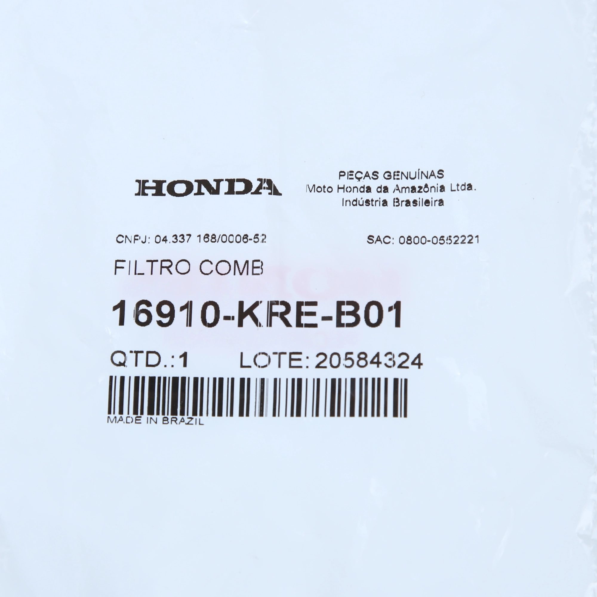 O filtro de combustível original Honda é responsável por reter impurezas presentes no combustível antes que cheguem ao sistema de alimentação, protegendo a bomba, o injetor e garantindo funcionamento correto do motor. Produzido conforme o padrão original de fábrica, assegura filtragem eficiente, vazão adequada e maior durabilidade dos componentes do sistema, sem necessidade de adaptações.