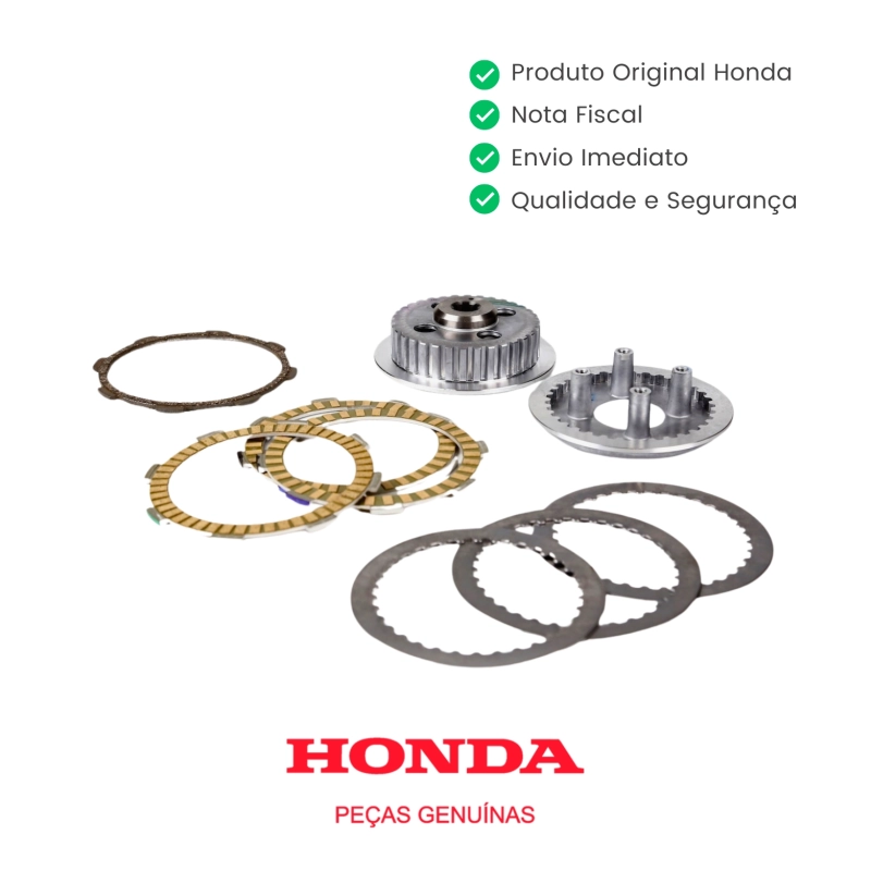 Kit de embreagem original Honda desenvolvido para garantir o funcionamento correto do sistema de acoplamento e transmissão da força do motor. Mantém a performance, durabilidade e confiabilidade da motocicleta, com encaixe perfeito e sem adaptações.