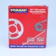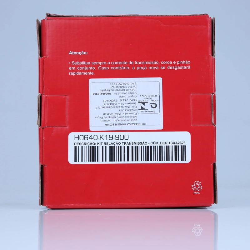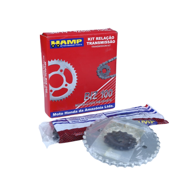 O kit relação Original Honda HAMP é composto por corrente, coroa e pinhão, sendo responsável pela transmissão de força do motor para a roda traseira. Desenvolvido conforme o padrão de fábrica, garante desempenho eficiente, durabilidade e segurança na pilotagem. Ideal para manutenção preventiva ou substituição completa do sistema de transmissão.