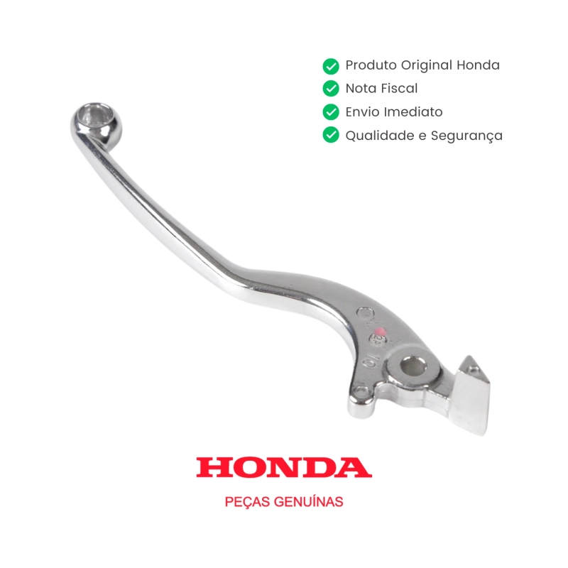 O manete de freio dianteiro original Honda é responsável pelo acionamento seguro e preciso do sistema de freio, garantindo controle, conforto e confiabilidade durante a pilotagem. Peça genuína Honda, desenvolvida conforme o padrão de fábrica, assegurando encaixe perfeito, alta durabilidade e preservação da originalidade da motocicleta.