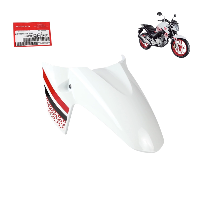 O paralama dianteiro original Honda é responsável por proteger a parte frontal da motocicleta contra respingos de água, lama e detritos da via, contribuindo para a preservação dos componentes, segurança na pilotagem e manutenção do visual original da moto.