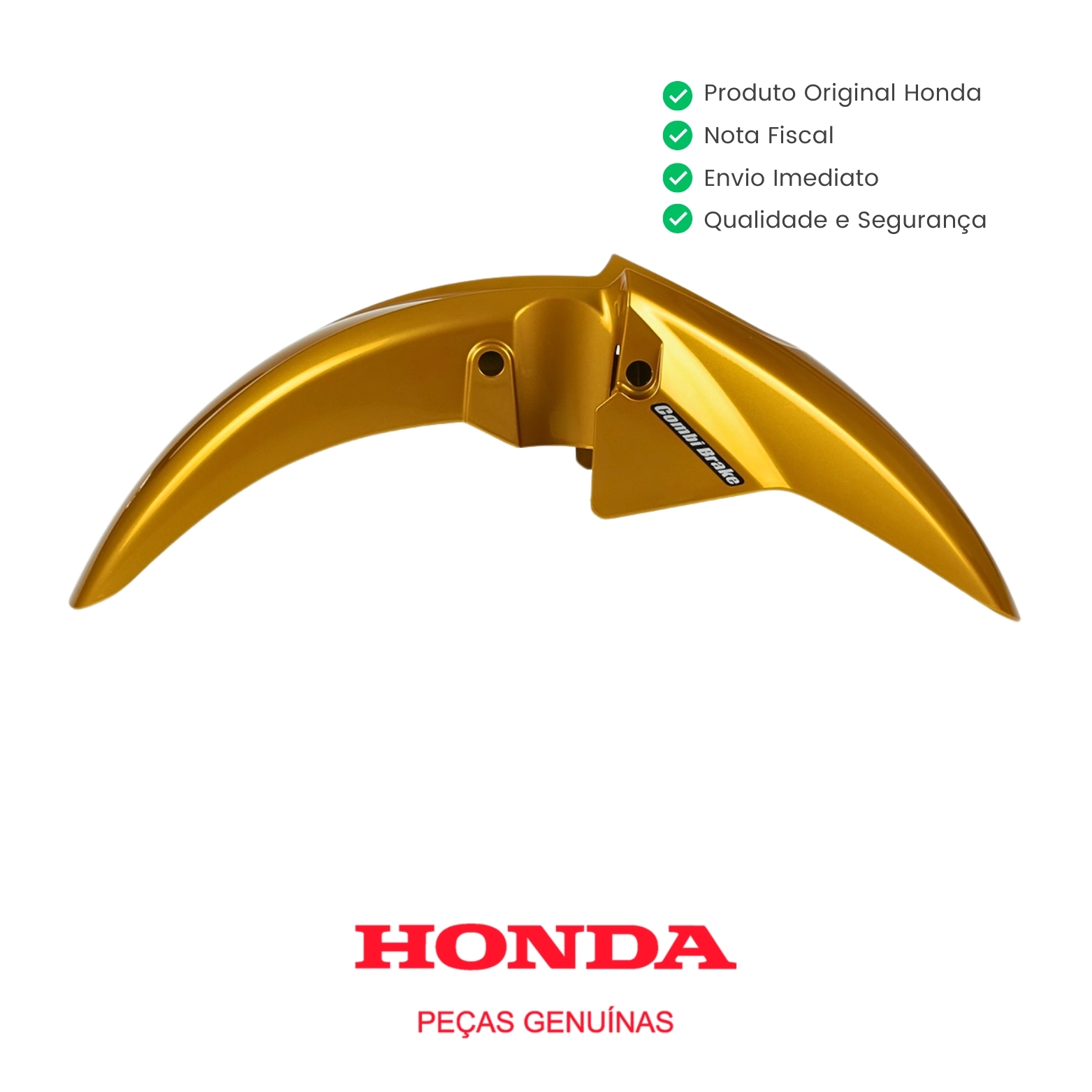 O paralama dianteiro original Honda é responsável por proteger a parte frontal da motocicleta contra respingos de água, lama e detritos da via, ajudando a preservar componentes e manter a segurança e o visual original da moto.