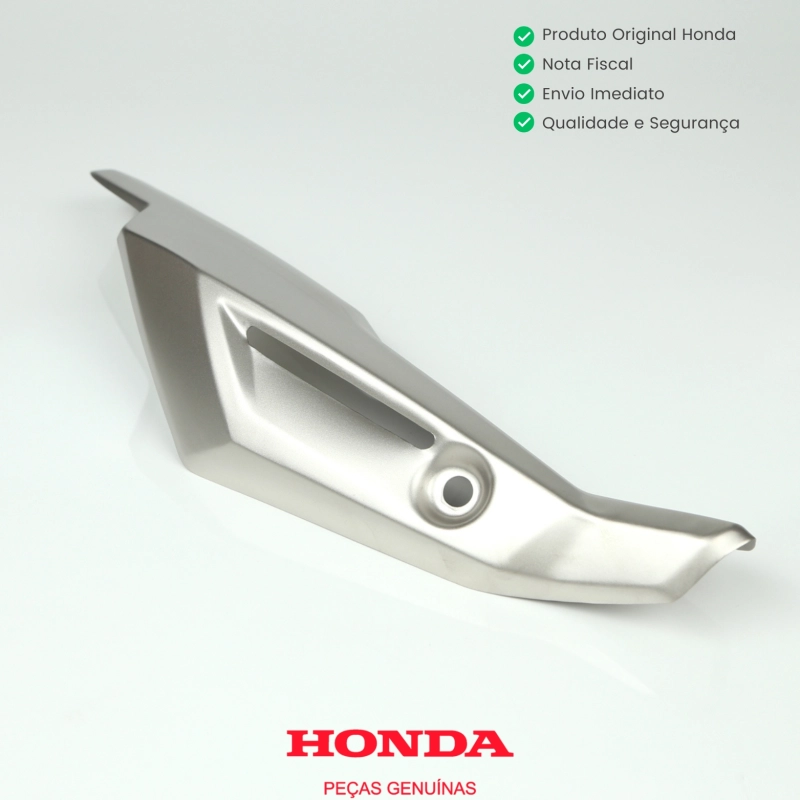O protetor do escapamento original Honda tem a função de proteger o escapamento contra contato direto e altas temperaturas, ajudando a reduzir o risco de queimaduras e preservando o acabamento do conjunto de exaustão. Produzido conforme o padrão original de fábrica, garante encaixe perfeito, resistência térmica e excelente durabilidade.