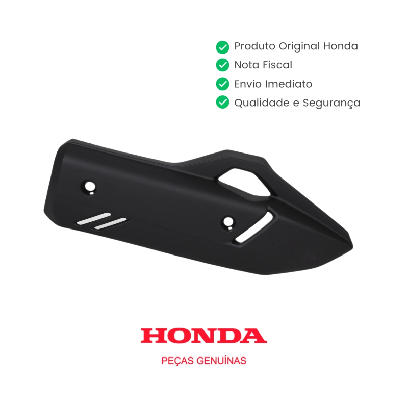 O protetor do escapamento original Honda tem a função de proteger o escapamento contra contato direto e altas temperaturas, ajudando a reduzir o risco de queimaduras e preservando o acabamento do conjunto. Produzido conforme o padrão original de fábrica, garante encaixe perfeito, resistência térmica e excelente durabilidade.