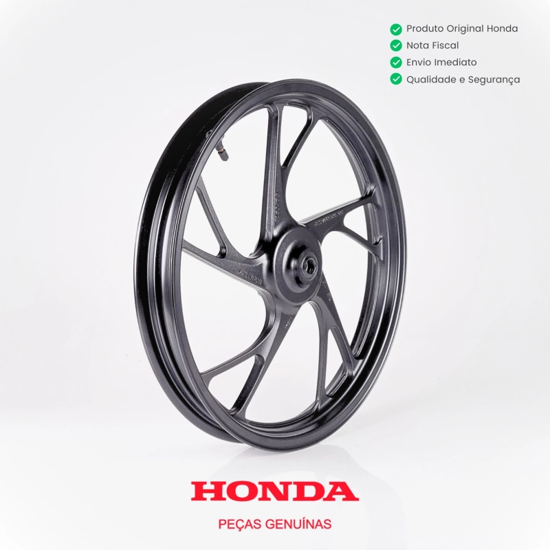 A roda dianteira original Honda é responsável por garantir estabilidade, segurança e desempenho durante a pilotagem, sendo um componente essencial do conjunto de rodagem da motocicleta.