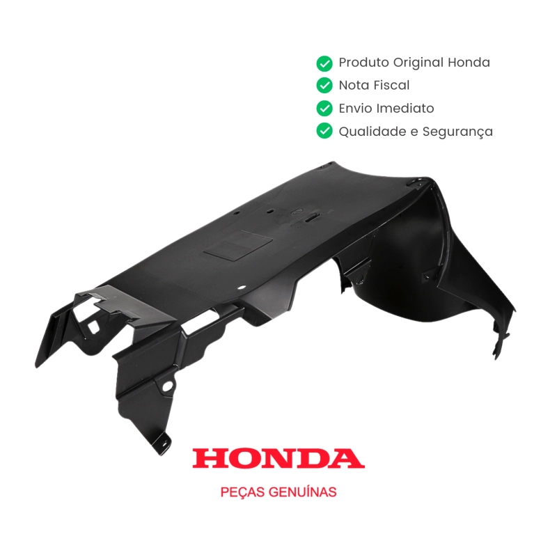 A tampa inferior do assoalho original Honda tem a função de proteger a parte inferior da motocicleta contra sujeira, detritos e respingos, além de contribuir para o acabamento e integridade do conjunto do assoalho. Produzida conforme o padrão original de fábrica, garante encaixe perfeito, resistência adequada e preservação da estética original, sem necessidade de adaptações.